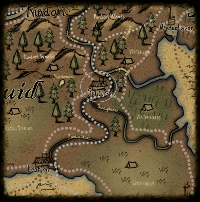 "Over het algemeen is Splittown gewoon een rustig handelsdorpje en soms komt er vanaf Avatar Lake een persoon, voorwerp of magie, die de boel even opschudt, maar ook als je daar niet geïnteresseerd in bent is er genoeg anders om je mee te vermaken. Zoals de gezellige herberg, waar vaan verhalenvertellers aanschuiven, handel met de vele kleurrijke lieden en reizigers. Ook is dit een ideale plek om nieuws uit de hoofdstad te krijgen of op te stappen op een van de vele boten richting Leafton, Rindori of Waterhaven."